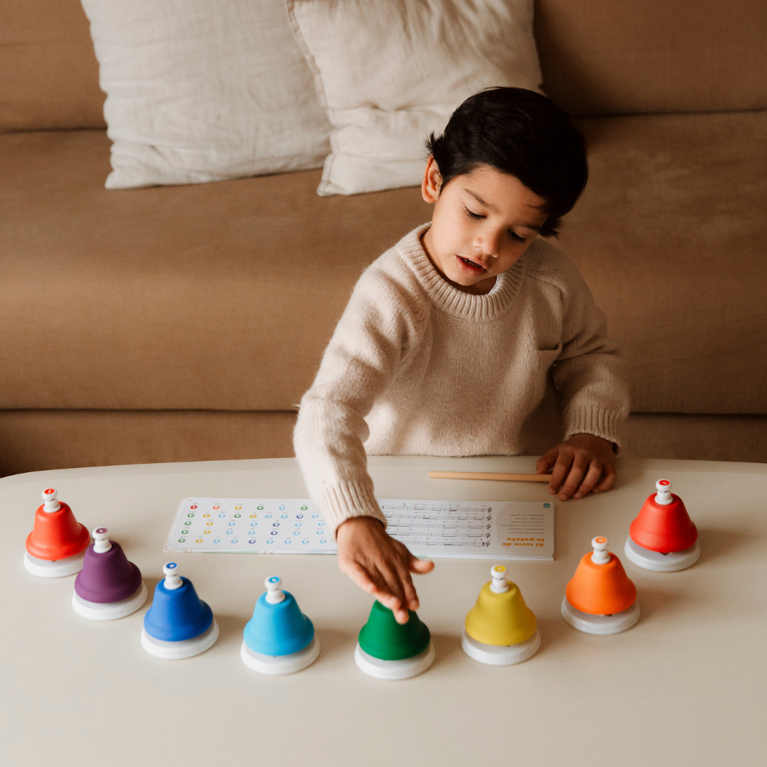 Jak działa? Wystarczy nacisnąć dzwonek, a każdy z nich wydaje czysty, melodyjny dźwięk. Osiem kolorowych dzwonków odpowiada ośmiu różnym nutom pełnej gamy – razem tworzą kompletną skalę, na której dziecko może grać proste melodie już przy pierwszej zabawie.