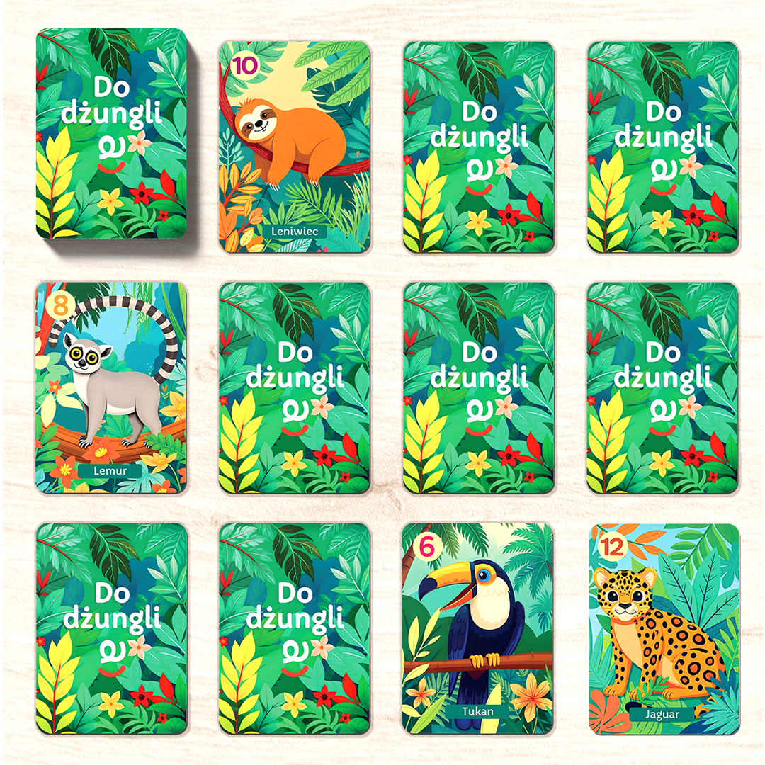 „Do dżungli” to doskonała pierwsza gra karciana dla dzieci – została zaprojektowana z myślą o tym, żeby dzieci już od 3. roku życia mogły w nią grać, skupiając się na dopasowywaniu kart i ćwiczeniu pamięci! A starsze dzieci (6+) wykorzystując strategiczne i dedukcyjne myślenie, mogą odgadywać karty przeciwników i strategicznie zadawać pytania.