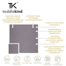Jest wyjątkowa również dlatego, że składa się z 9 elementów, które możesz łączyć jak puzzle, co pozwala na dostosowanie jej rozmiaru do własnych potrzeb! Jeśli potrzebujesz większej powierzchni, wystarczy dokupić dodatkowe zestawy i połączyć je razem. To idealne rozwiązanie, gdy chcesz stworzyć większą przestrzeń do zabawy. Toddlekind zadbał również o higienę – matę łatwo utrzymać w czystości. Wystarczy przetrzeć ją wilgotną szmatką, dzięki czemu jest świetnym wyborem dla rodziców, którzy cenią sobie zarówno wygodę, jak i estetykę. Dodatkowo, materiał jest w pełni bezpieczny, spełniający najbardziej rygorystyczne europejskie normy bezpieczeństwa, więc możesz być spokojny o zdrowie swojego maluszka.