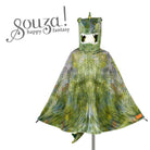 Kostium peleryna zielony T-rex z dużym zabudowanym kapturem, tworzącym jednocześnie maskę dinozaura holenderskiej marki Souza! to przepiękne przebranie dla chłopca. Od czubka głowy wzdłuż całego grzbietu ma wypustki 3D, posiada także uzębioną szczękę i gadzie oczy, z tyłu zaś – gruby ogon. Maskujący nadruk na tkaninie imituje skórę dinozaura. Zapinany na suwak. Dolna szczęka z przodu kaptura zapinana jest z kolei na solidny rzep.