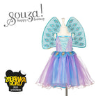 Kostium sukienka ze skrzydłami w pawie pióra Tamara holenderskiej marki Souza! to przepiękne, starannie wykonane przebranie dla dziewczynki. Sukienka ma klasyczny krój na ramiączkach i gumkę w pasie. Jest miękka i wsuwana przez głowę. Zachwyca dbałością o detale. Góra tej turkusowo-fioletowej sukienki jest dwustronna: z przodu ma boczne pasy z fioletowych cekinów, z tyłu jest gładka, satynowa i turkusowa. Dół stanowi kilkuwarstwowa spódniczka z niebieską podszewką i wielobarwnym (turkusowo-fioletowym) tiulem. Z niego jest także wykonane obszycie w talii z haftowanymi aplikacjami – pawimi oczkami na każdym elemencie. W skład zestawu wchodzą także półprzeźroczyste skrzydła, również zdobione pawimi piórami i ze złotą obwódką. Można je nosić razem z sukienką lub osobno. Zakładane są na wygodne gumowane złote ramiona. Strój jest efektowny i komfortowy do noszenia. To idealne przebranie na bal przebierańców czy Halloween. Sprawdzi się także jako prezent.