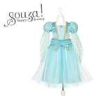 Kostium sukienka księżniczki/wróżki Victoria holenderskiej marki Souza! to przepiękne przebranie dla dziewczynki. Sukienka ma jasnobłękitny kolor ze złotymi aplikacjami i detalami. Uszyta jest z tiulu, satyny i aksamitu. Ma długie rękawy z bufkami i trójwarstwową spódniczkę. Zapinana jest z tyłu na suwak.