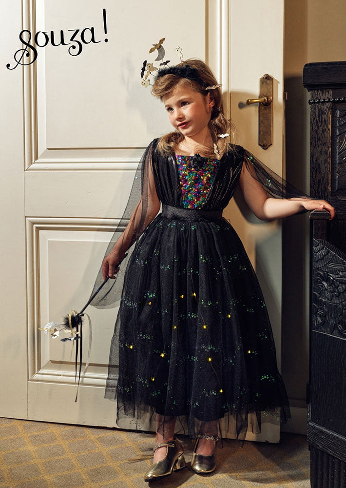 Kostium sukienka z lampkami LED czarownica Agatha holenderskiej marki Souza! to przepiękne i starannie wykonane przebranie dla dziewczynki, które zachwyca dbałością o detale. Sukienka ma klasyczny krój z długimi tiulowymi rękawami, częściowo ozdobionymi cekinami. Góra wykonana jest z różnych materiałów i zdobiona wstawką z kolorowych cekinów na dekolcie. Wielowarstwowa czarna spódnica posiada natomiast: wierzchnią warstwę tiulu ozdobioną cekinami, odpinaną warstwę z przewodem i bezpiecznymi lampkami LED oraz satynową podszewkę zapewniającą wygodę. Dzięki gumce w pasie sukienka jest wygodna i komfortowa w noszeniu.