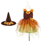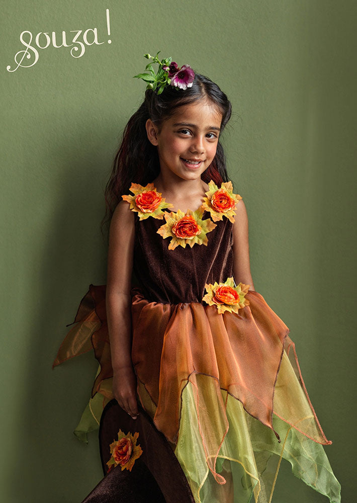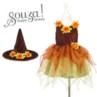 Kostium sukienka z kapeluszem czarownica Sabrina holenderskiej marki Souza! to przepiękne, starannie wykonane przebranie dla dziewczynki. Zachwyca dbałością o detale, ma klasyczny krój i gumkę w pasie, która zapewnia komfort noszenia. Welurowa góra ma rdzawo-brązowy kolor i trzy jesienne kwiaty przy dekolcie. Wielowarstwowy, krótki dół ma jasnozieloną satynową podszewkę oraz ząbkowane tiulowe spódniczki w odcieniach zieleni, żółci i pomarańczu. Kwiat zdobi także pas sukienki oraz szerokie rondo welurowego stożkowego kapelusza, który znajduje się w zestawie. To idealny kostium na bal przebierańców, Halloween czy Sylwestra. Sprawdzi się także jako prezent.