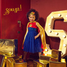 Kostium sukienka z peleryną Superbohaterka holenderskiej marki Souza! to przepiękne przebranie dla dziewczynki. Sukienka ma klasyczny krój, czerwono-granatową aksamitną górę na szerokich ramiączkach, aplikację złotej gwiazdy, gumkę w pasie i rozkloszowany tiulowy dół w kolorze granatowym z drobinkami brokatu. Złota peleryna ma czerwoną podszewkę i aplikację czerwonej gwiazdy na plecach. Zapinana jest pod szyją na rzep.
