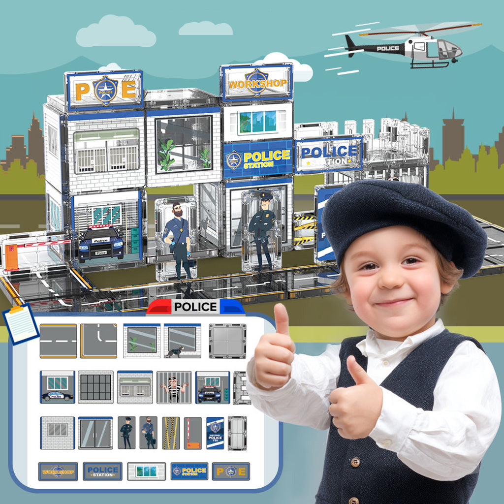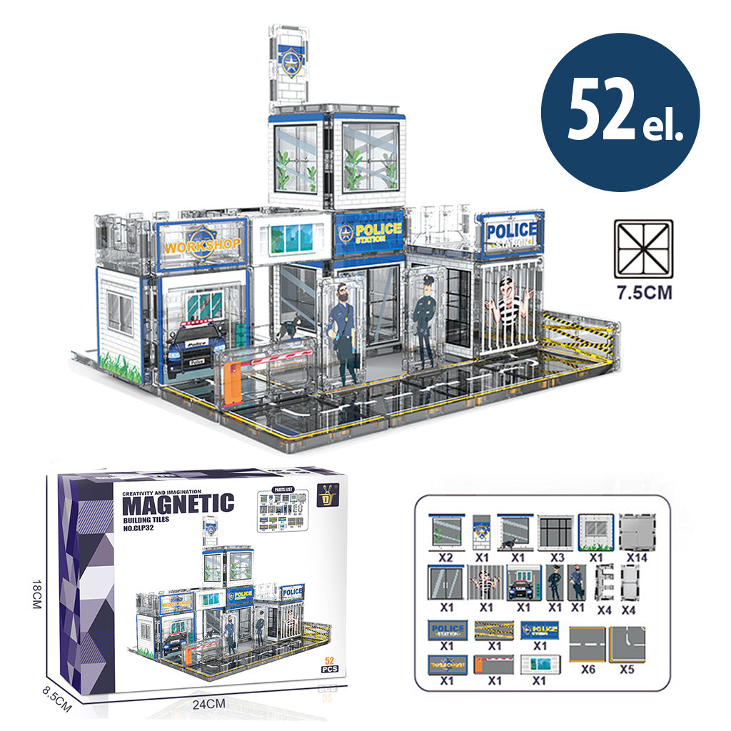Ten zestaw, składający się z 52 elementów, jest idealny dla małych stróżów prawa w wieku od 3 lat i starszych. Przezroczyste płytki magnetyczne z tematycznymi wkładkami grafik tworzą solidny, dwupoziomowy budynek, który staje się centrum dowodzenia w każdym pokoju!