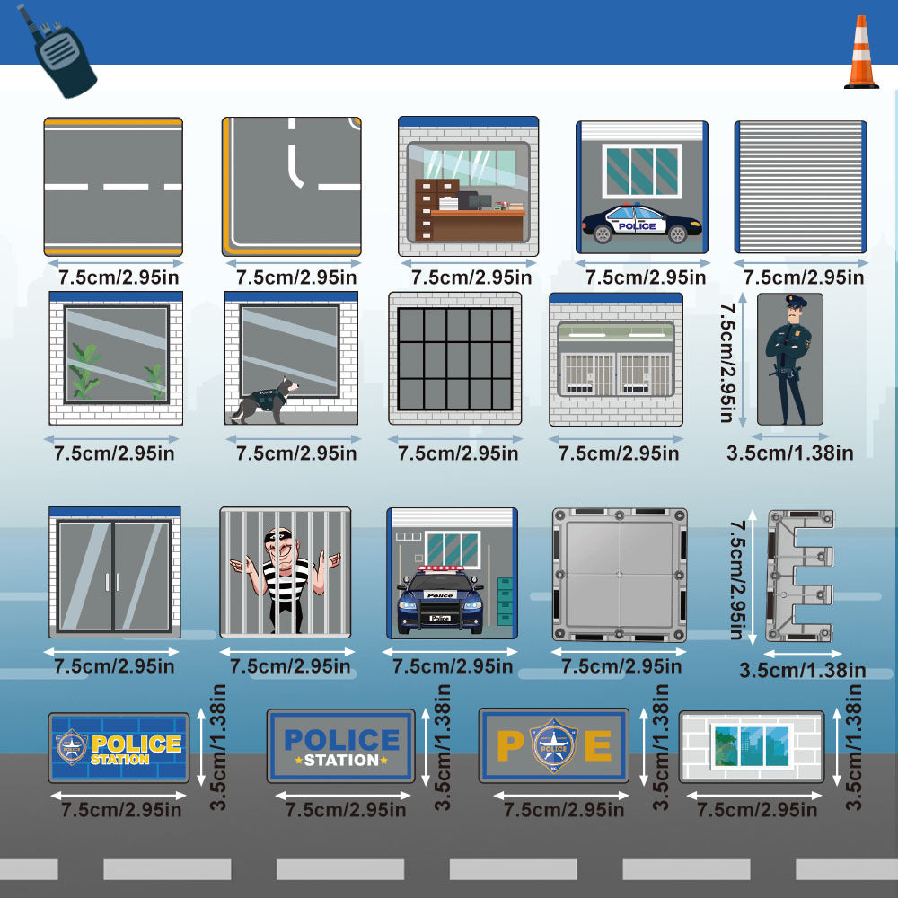 Realistyczna Scena Akcji: Zestaw zawiera wszystkie kluczowe elementy niezbędne do odgrywania policyjnych scenariuszy. Płytki z grafikami przedstawiają: