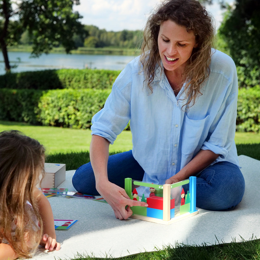 Gra polega na budowaniu konstrukcji na drewnianej podstawie zgodnie z różnymi perspektywami, przedstawionymi na kartach z zadaniami. Dzieci mogą korzystać z kolorowych klocków, drzewek, ludzików, aby odtworzyć sceny z kart, a przezroczyste karty umożliwiają dokładne sprawdzenie, czy konstrukcja jest poprawna z różnych punktów widzenia. Ta gra nie tylko uczy dzieci logicznego myślenia, ale także rozwija ich zdolności językowe, ponieważ muszą one opisywać to, co widzą i jak układają elementy.