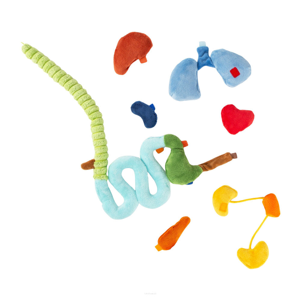 Erwin ma otwierany brzuszek zapinany na rzep, a w środku kryją się pluszowe organy: serce, płuca, żołądek, nerki i inne narządy. Każdy z nich można wyjmować i ponownie umieszczać w odpowiednim miejscu dzięki kolorowemu kodowaniu i rzepowym mocowaniom. W komplecie znajduje się również ilustrowana książeczka, która w prosty sposób tłumaczy funkcje i znaczenie poszczególnych części ciała.