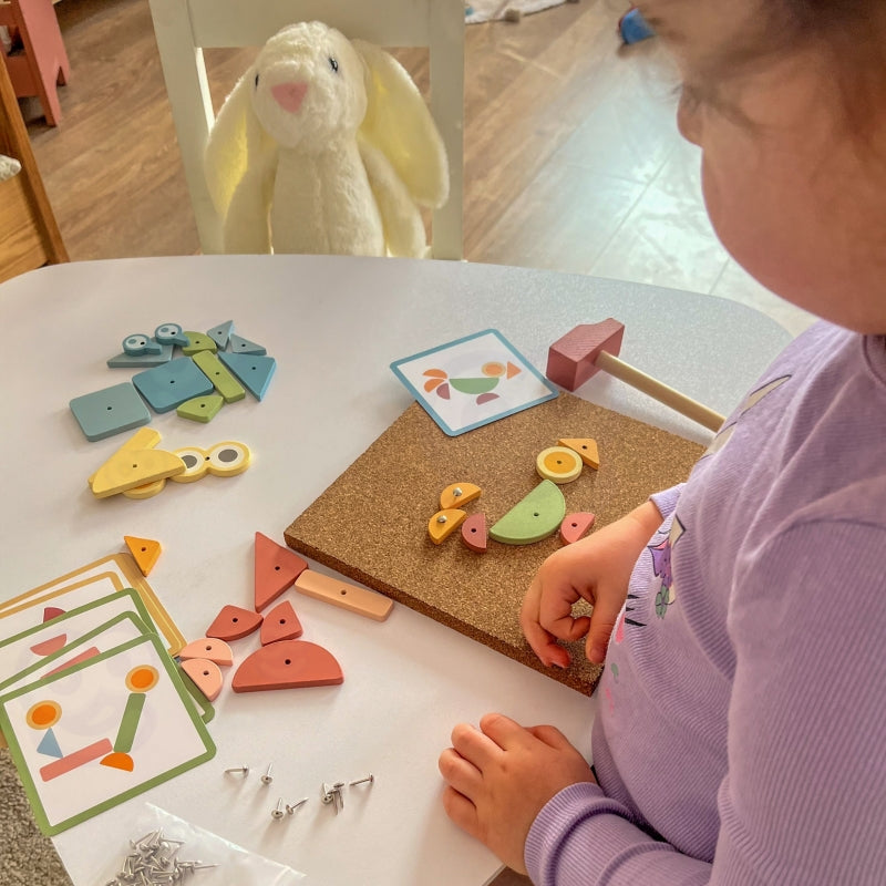 Dzięki aż 82 elementom i trzem poziomom trudności, zabawa z przybijanką nigdy się nie nudzi! To świetny sposób na naukę przez działanie – rozwija koncentrację, precyzję, logiczne myślenie oraz wyobraźnię przestrzenną.
