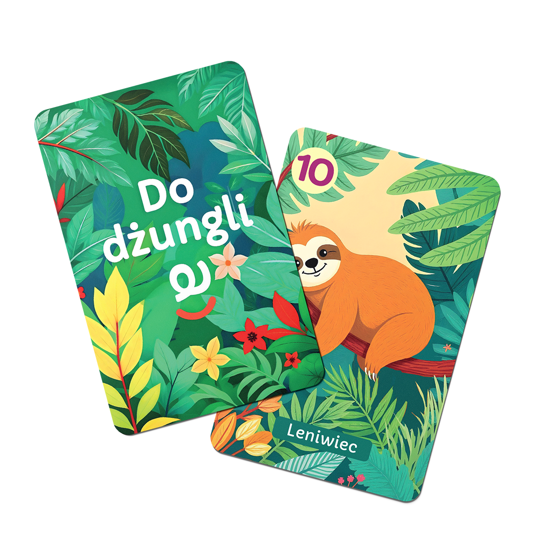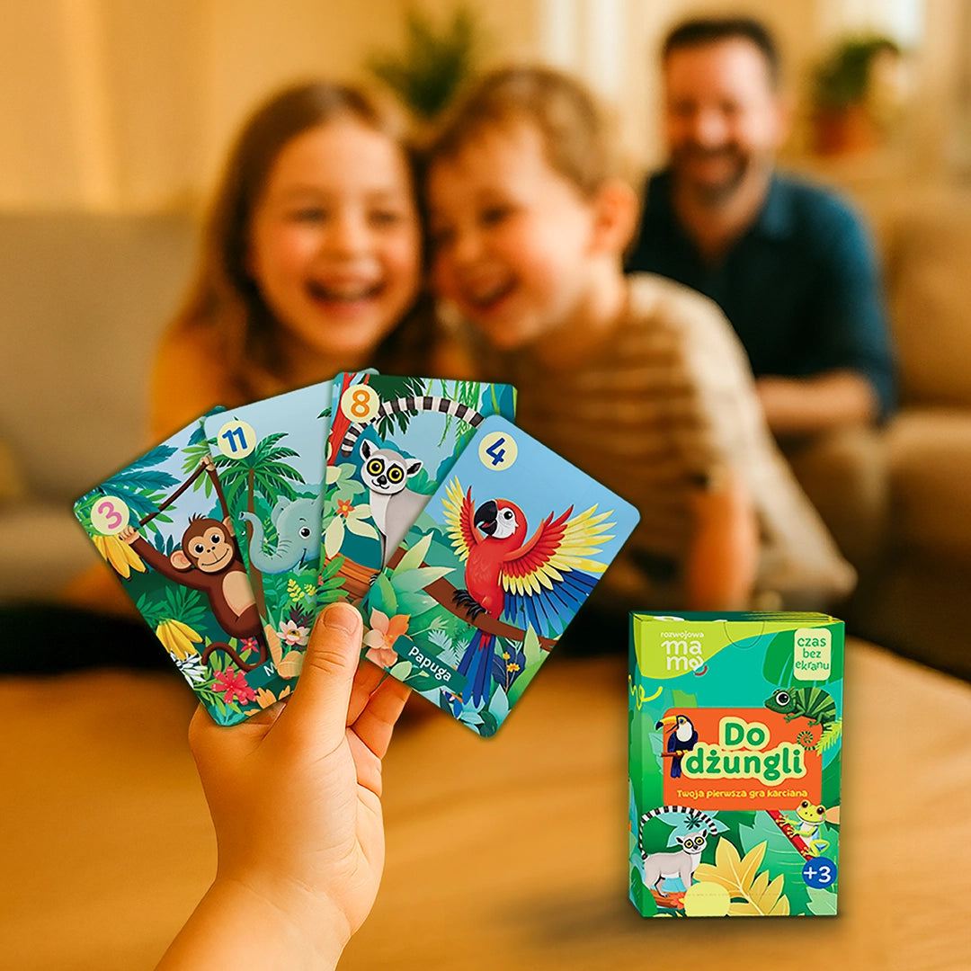 „Do dżungli” to doskonała pierwsza gra karciana dla dzieci – została zaprojektowana z myślą o tym, żeby dzieci już od 3. roku życia mogły w nią grać, skupiając się na dopasowywaniu kart i ćwiczeniu pamięci! A starsze dzieci (6+) wykorzystując strategiczne i dedukcyjne myślenie, mogą odgadywać karty przeciwników i strategicznie zadawać pytania.