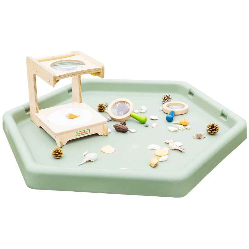 Można go wykorzystać do zabawy sensorycznej, eksperymentów STEM, zabaw plastycznych, sortowania i układania czy tworzenia miniaturowych światów.