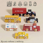 Wszystkie autka wykonano w całości z certyfikowanego drewna FSC®, pomalowanego nietoksycznymi, bezpiecznymi farbami wodnymi. Samochody posiadają drewniane koła i są w pełni kompatybilne ze standardowymi torami kolejowymi, co pozwala rozszerzyć zabawę o dodatkowe scenariusze i zestawy.