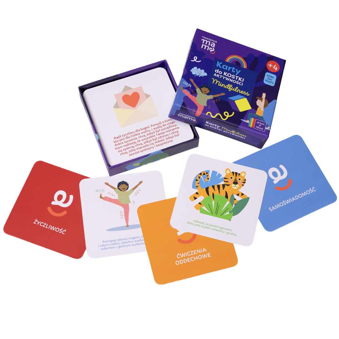 Karty do kostki aktywności – mindfulness wprowadzają dzieci w wieku 4 lat i starsze w świat mindfulness – czyli uważności – w ramach 6 angażujących kategorii. Wszystkie powstały w oparciu o programy opisywane w literaturze naukowej, w tym Kindness Curriculum, MindUp i inne opracowane przez wiodące ośrodki badawcze z myślą o dzieciach w wieku przedszkolnym i wczesnoszkolnym.