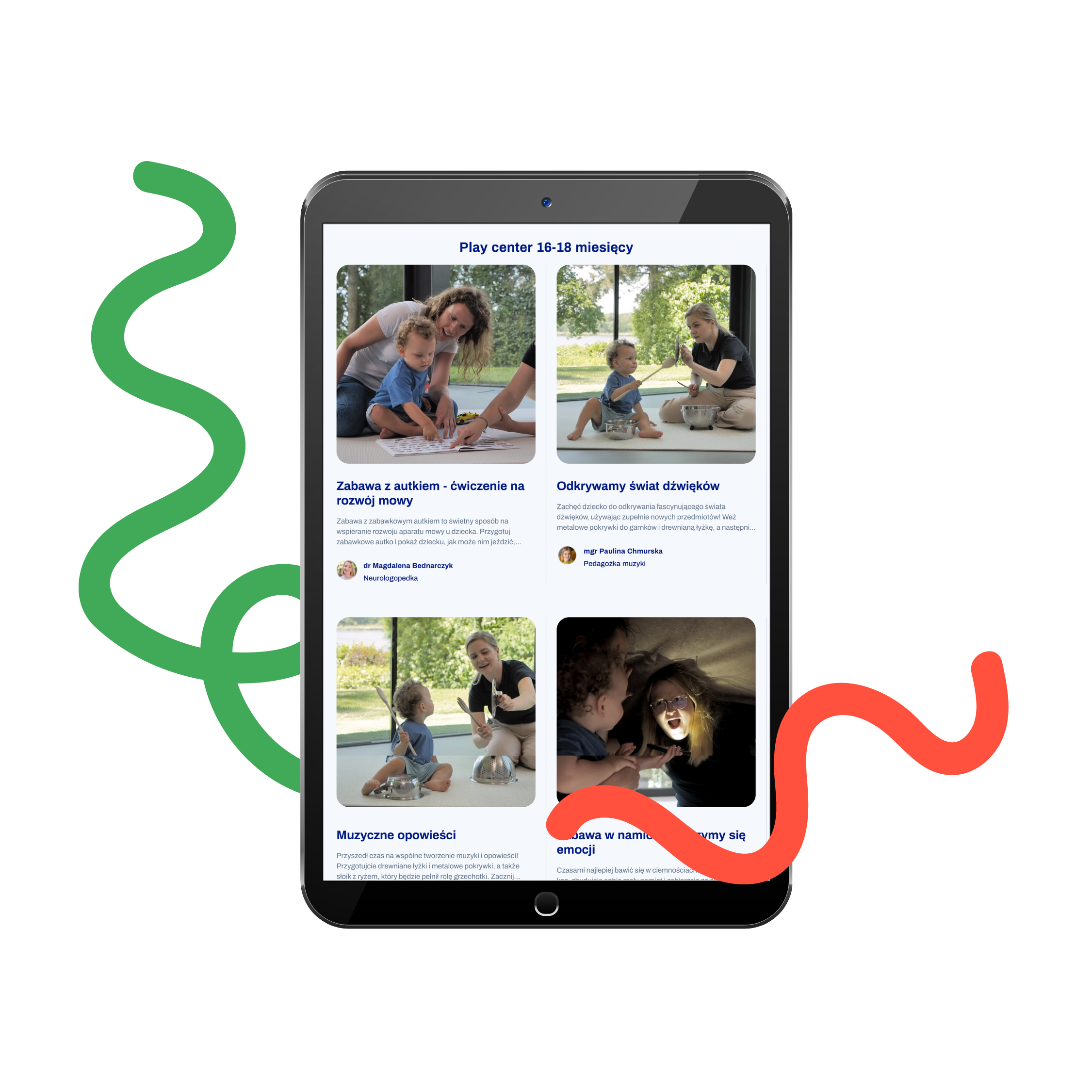 Naszą misją na ten rok jest wspierać rodziców, aby świadomie towarzyszyli swojemu dziecku w pierwszych latach życia. Dlatego już teraz zachęcamy Cię do odkrycia bezpłatnej platformy wiedzy dla rodziców Play Center, na której znajdziesz zabawy w formie wideo polecane przez specjalistów z dziedzin: psychologii dziecięcej, edukacji muzycznej, fizjoterapii dziecięcej, neurologopedii, ortoptystki, doradztwa laktacyjnego, pedagogiki, pierwszej pomocy oraz pediatrii. Te propozycje aktywności pokażą Ci, jak bawić się z dzieckiem w sposób wspierający jego wszechstronny rozwój oraz pomagający osiągać kamienie milowe odpowiednie dla jego wieku.