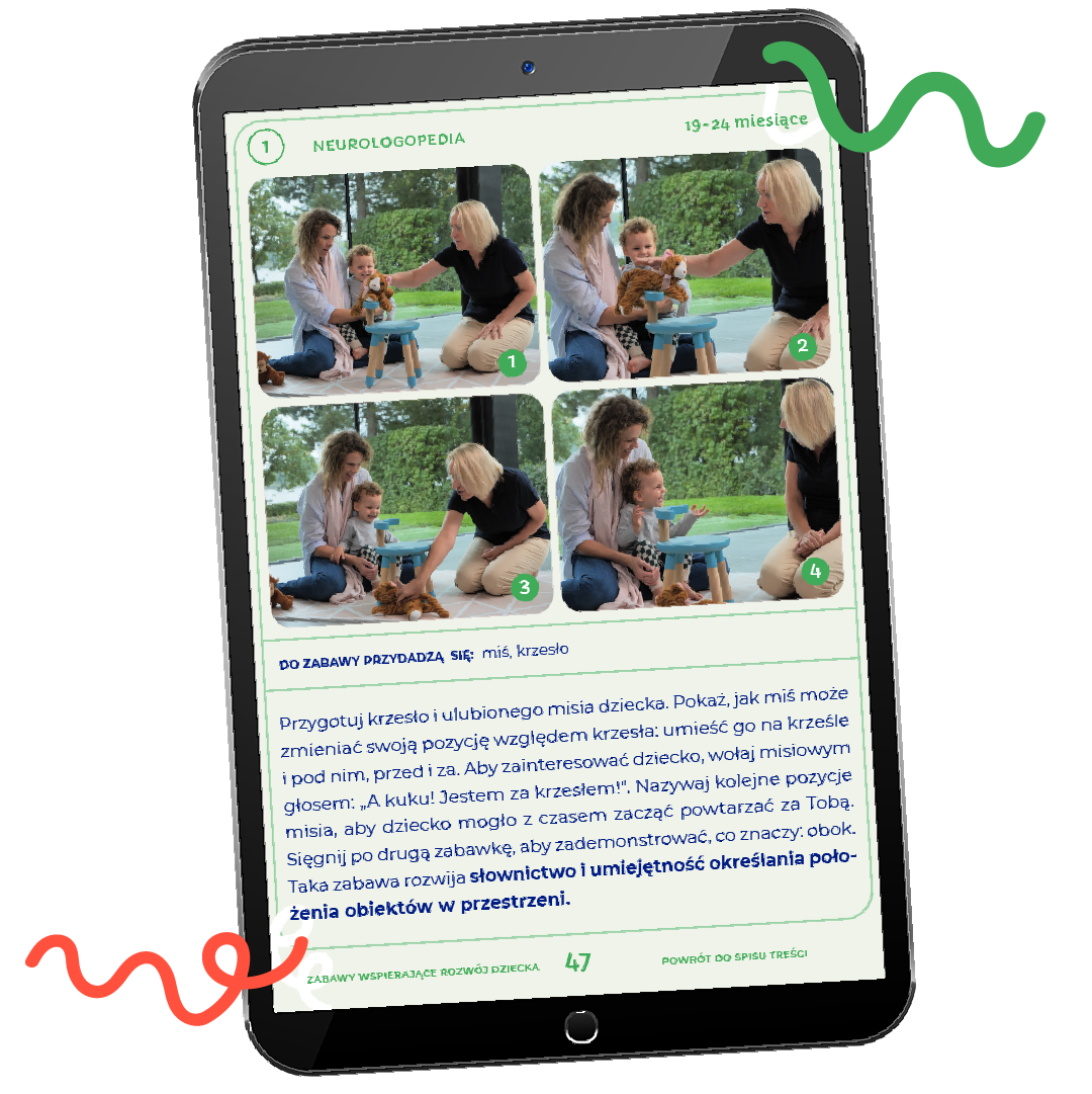 - Zdjęcia demonstrujące prawidłowy sposób wykonania zabawy, prezentowany przez specjalistę. Wiesz dokładnie, co robić i dlaczego to ważne!