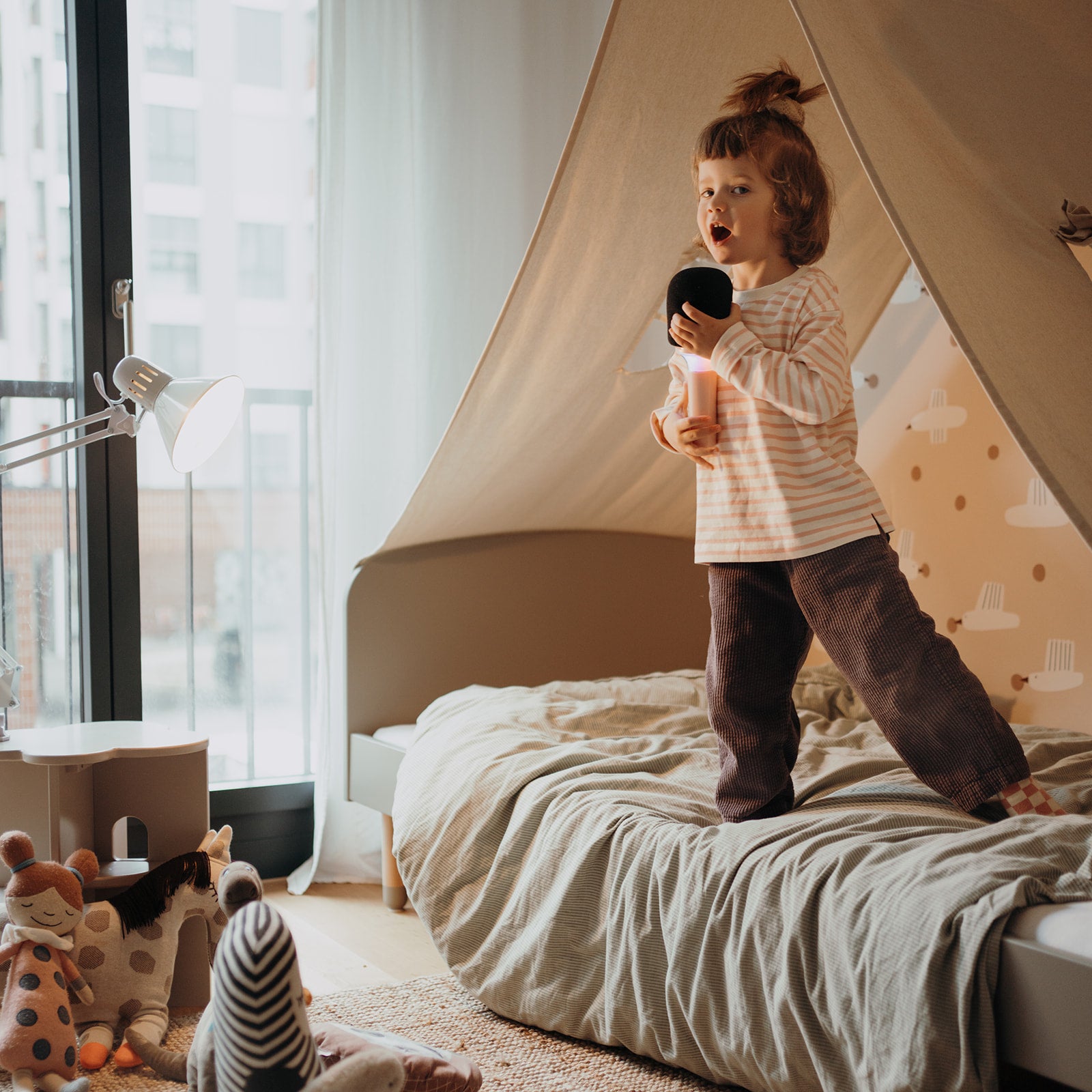 KIDYMIC to idealny towarzysz Twoich karaoke! Ten wielofunkcyjny mikrofon łączy zabawę muzyczną z efektami świetlnymi, zmianą głosu i łącznością Bluetooth. Dzięki niemu dzieci mogą śpiewać i bawić się godzinami, a cała rodzina przeżyje niezapomniane muzyczne chwile.